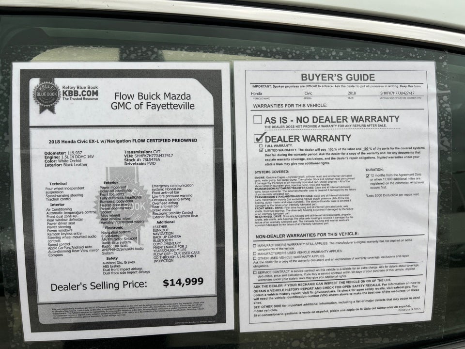 Flow Buick Mazda GMC of Fayetteville is excited to offer this great 2018 Honda Civic White Orchid EX-L with the following features: FLOW CERTIFIED 12 MONTHS/12000 MILE POWERTRAIN WARRANTY 3 day money back guarantee and a free maintenance package! ** LEATHER SUNROOF NAVIGATION BACK UP CAMERA Bluetooth® COMPLIMENTARY MAINTENANCE FOR 2 YEARS/24 000 MILES FLOW QRP - OUR USED CARS GO THROUGH A 146 POINT INSPECTION Civic EX-L w/Navigation FLOW CERTIFIED PREOWNED 4D Hatchback 1.5L I4 DOHC 16V CVT FWD White Orchid Black Leather.