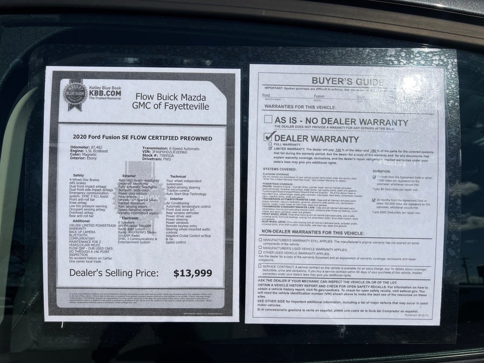 Flow Buick Mazda GMC of Fayetteville is delighted to offer this attractive-looking 2020 Ford Fusion Magnetic SE with the following features: FLOW CERTIFIED 2YR/100 000 MILE POWERTRAIN WARRANTY 3 day money back guarantee and a free maintenance package! ** 100 000 LIMITED POWERTRAIN WARRANTY BACK UP CAMERA Bluetooth® COMPLIMENTARY MAINTENANCE FOR 2 YEARS/24 000 MILES FLOW QRP - OUR USED CARS GO THROUGH A 146 POINT INSPECTION No accident history on Carfax One owner local trade Fusion SE FLOW CERTIFIED PREOWNED 4D Sedan 1.5L EcoBoost 6-Speed Automatic FWD Magnetic Ebony Cloth.